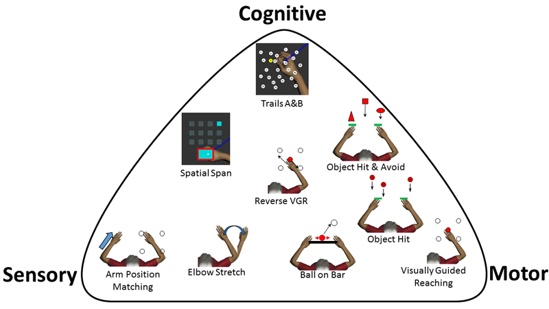 Kinarm Standard Tests™ provide sensitive and objective measures of sensory, motor, and cognitive brain functions through the precise measurement of human behavior – a method we call behaviorography™. By using the suite of standardized protocols, a clinical researcher can assess the neurological impairments of a subject in a Kinarm Lab in 30 to 60 min, depending on tasks selected.